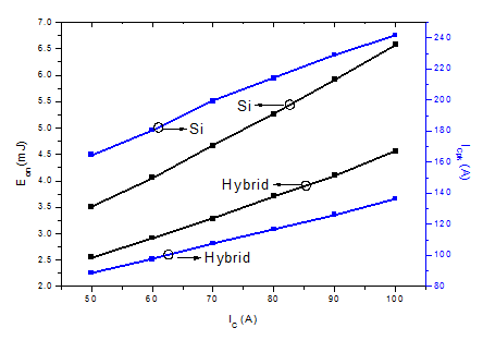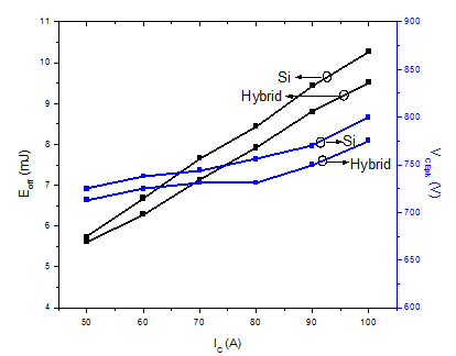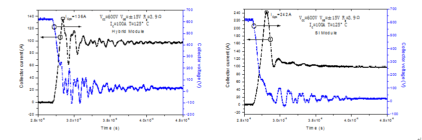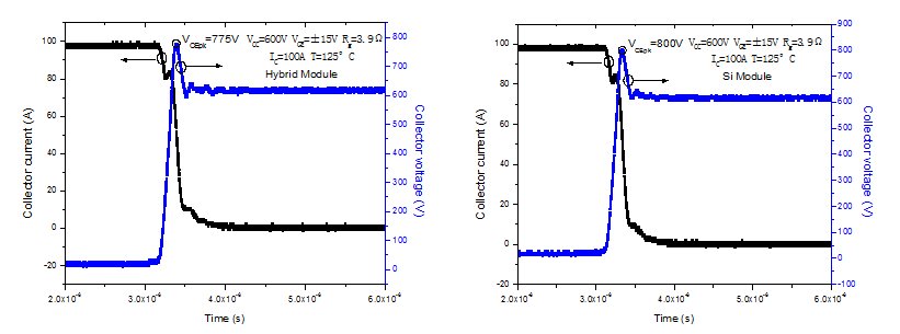 Figure 1 shows the measured turn-on waveform of the hybrid and Si module. The hybrid module results in a peak current (ICpk) of136A, which can be reduced significantly by 43.6% compared to the Si module.